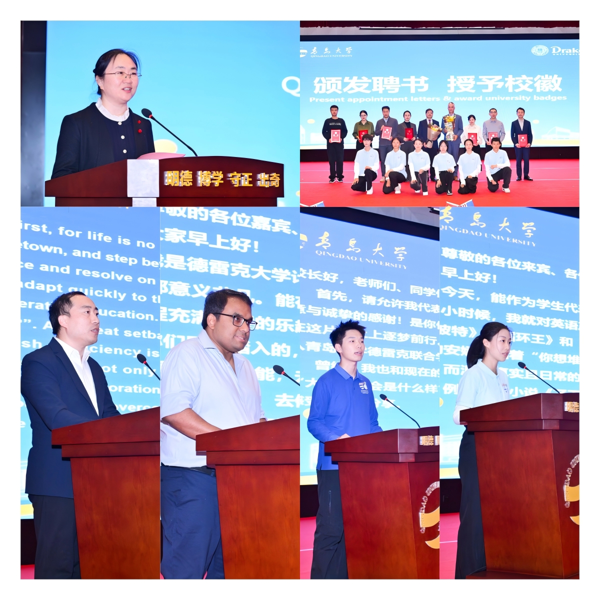 魏志强和马蒂·马丁共同为学院新一届班主任颁发聘书,并为学生代表授予两校校徽。青岛大学教师代表李尚勇、德雷克大学教师代表阿里穆尔·雷兹、2024级学生代表陈建宇和2025级新生代表秦静愉先后进行发言。