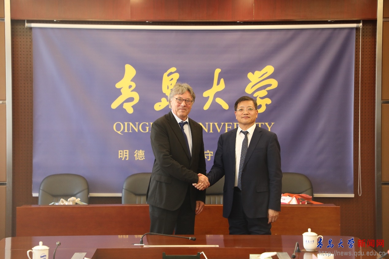 魏志强在致辞中表示,青岛大学坚持国际化办学战略,连续多年入围世界主流大学排行榜,与40个国家和地区的245所高校建立合作关系。山东省作为中国工业门类体系最齐全的省份,青岛市作为其中重要的产业和创新高地,为两校合作提供了有力的产业与环境支撑。青岛不仅是海尔等家电巨头的总部所在地,也是中国新能源汽车制造的重要基地之一,同时在新能源、人工智能、计算与数据中心等领域拥有显著集群优势。青岛被誉为“中国算力规模最大、架构最全的城市之一”,这些产业基础与EIGSI在机械、机电、计算机、能源等领域的专业优势高度契合,为未来合作共建实验室、开展产学研项目、推动学生实习与就业提供了丰富场景。他强调,青岛大学与拉罗谢尔工程师学院均有120余年的办学历史,在机械、电气、计算机等领域均具备专业优势。学校高度重视与法国高校的合作,拉罗谢尔工程师学院作为一所优秀的工程师院校,其“通科培养”和跨学科教育模式值得借鉴。魏志强指出,希望以此次会谈为契机,推动两校在共建中法工程师学院、开展本硕联合培养、共建科研平台等方面开展务实合作,共同培养具有国际视野的卓越工程人才。