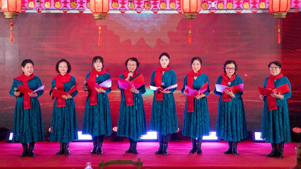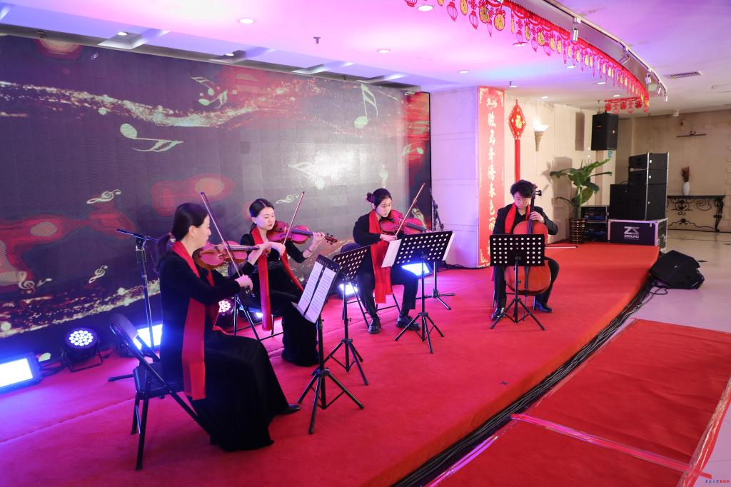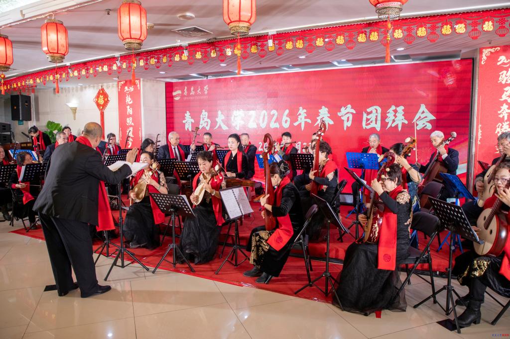 团拜会文艺演出环节精彩纷呈。青岛大学老教师民族乐团以悠扬的民乐演奏《名曲联奏》与《花好月圆》拉开序幕,奏响了喜庆祥和的乐章。外语学院学生则以青春活力的歌曲联唱《光亮》《少年》,展现了青年学子的朝气蓬勃。我校校友带来的弦乐四重奏,深情演绎了《莫扎特弦乐小夜曲》的经典与《梁山伯与祝英台》的缠绵。离退处老教师舞蹈队以优雅舞姿献上舞蹈《我爱你中国》,表达了对祖国的深情祝福。青岛大学老教师朗诵协会与“青大之声”学生团队联手,带来了慷慨激昂的朗诵《耕励奋进 蓄势开新》,彰显了青大人继往开来的精神风貌。最后,艺术学院学生以一曲深情饱满的《灯火里的中国》,将演出推向高潮,唱出了对祖国繁荣昌盛的美好祝愿。