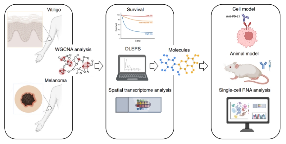 近年来,免疫治疗已成为肿瘤治疗领域的重要突破,但目前只有少部分患者能够从该疗法中得到持久的生存获益。前期研究发现,在黑色素瘤中白癜风样色素脱失是一种常见且通常较轻的免疫相关不良事件,其发生发展与增强的抗肿瘤免疫反应和延长患者生存期呈正相关。该研究通过对比分析白癜风与黑色素瘤的分子特征构建了一套精准的生物标志物VGS,该标志物可高效区分“冷肿瘤”与“热肿瘤”,为患者免疫治疗分层提供了科学依据。此外,该研究进一步筛选并验证了Fulvestrant(氟维司群)是一种能够在临床前模型中增强PD-L1抗体疗法的候选药物。
