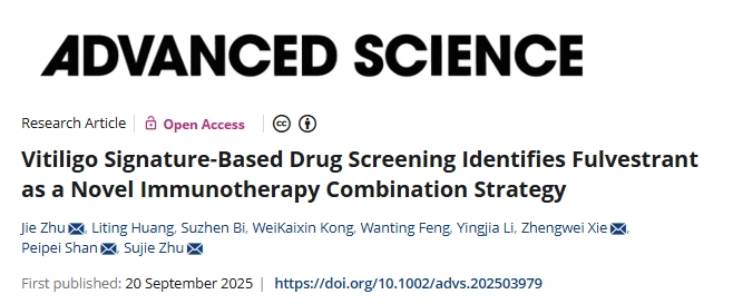 近日,我校转化医学研究院朱素杰教授、单佩佩副教授研究团队联合北京大学谢正伟教授团队在 Advanced Science 杂志在线发表题为“Vitiligo Signature-Based Drug Screening Identifies Fulvestrant as a Novel Immunotherapy Combination Strategy”的研究论文。朱杰、黄丽婷、毕素贞、孔维恺忻为本文的第一作者,朱素杰教授、单佩佩副教授、谢正伟教授、朱杰博士为本文通讯作者。青岛大学附属医院为第一单位和通讯单位。本研究得到了国家自然科学基金、山东省青创团队等项目的资助。