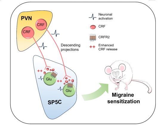 偏头痛是最常见的原发性头痛,表现为发作性的中重度搏动性头痛,同时有呕心、呕吐、畏声、畏光等伴随症状,人群中的总体发病率超过14.4%。三叉神经血管系统痛觉调制网络的神经元活性改变、递质释放异常及突触连接紊乱等病理可塑性变化是导致偏头痛发生发展的重要原因。下丘脑室旁核(PVN)作为整合神经内分泌功能的高级中枢,通过复杂的神经递质互作网络整合内、外感受信息,进而调节生存关键的生理过程和行为。PVN的催产素(OXT)、加压素和促肾上腺皮质激素释放因子(CRF)等肽能神经元亚群均被证实参与了痛觉的调制过程。近期电生理研究表明,PVN的OXT神经元受到电刺激是可发生活化,进而向三叉颈核复合体(TCC)释放大量OXT以限制三叉神经痛觉信号的上传,从而揭示了PVN的催产素信号在调节三叉神经痛觉传导中的作用和机制。然而,PVN 参与偏头痛调控的确切神经机制仍不清楚。更重要的是,CRF 神经元作为PVN中参与痛觉调控的重要神经元集群,它参与偏头痛调控的具体功能和机制尚不可知。为此,该研究采用全脑fMRI成像、神经束路示踪、化学遗传学操控、荧光递质探针检测及电生理记录等实验手段和技术方法,全面解析了PVNCRF神经元参与偏头痛调控的功能特性、连接组学、分子及受体等多层次机制。该研究首先明晰了PVNCRF-SP5CGlu这一神经回路结构,并发现异常激活的PVNCRF神经元向SP5C释放大量CRF神经肽,引起SP5C中谷氨酸能神经元上的CRFR2过度激活,最终导致偏头痛的中枢敏化。简而言之,这项研究为下丘脑调控偏头痛的神经回路和分子机制提供了新的见解,为偏头痛的为临床治疗NP提供新的干预手段和潜在靶点。