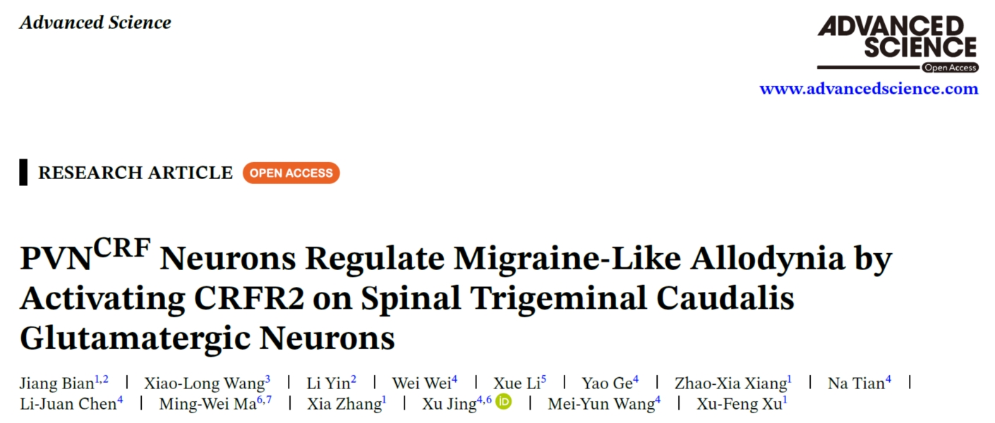 近日,我校神经精神疾病研究院张遐、徐许峰团队与河南省人民医院王梅云、靖旭团队在偏头痛的敏化机制和治疗上取得了新进展,研究成果以“PVN(CRF)Neurons Regulate Migraine-Like Allodynia by Activating CRFR2 on Spinal Trigeminal Caudalis Glutamatergic Neurons”为题发表在 Advanced Science 期刊上。我校基础医学院2022级博士研究生边疆为论文第一作者,基础医学院徐许峰、河南省人民医院王梅云和靖旭教授为文章通讯作者,青岛大学为第一单位和通讯单位。
