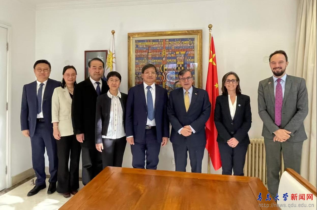 魏志强代表学校向阿尼瓦尔·卡夫拉尔出任驻华大使表示热烈祝贺,并简要地介绍了学校的办学特色和专业优势。他表示,拉美地区是学校国际交流合作最重要的区域之一,与乌拉圭共和国大学的合作,是其中的标杆和典范。两校共建的孔子学院架起了两国文明互鉴的桥梁,已经成为当地传播汉语言文化极具影响力的窗口。生物纳米制药实验室和中国-乌拉圭研究中心写入了两国元首联合声明,目前进展良好,已经取得阶段性成果。他说,下一步,两校将继续以孔子学院建设为基础,加强人才培养合作和人文交流,发挥两校学科优势,进一步拓展科研合作,同时结合青岛市的产业优势,联合山东港口集团、海信、海尔、青啤等国际知名企业,做好产学研转化,服务乌拉圭当地经济和社会发展。