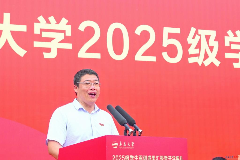 教师代表电气工程学院张智晟教授勉励新生要学在青大,志在天下,胸藏万卷,肩负山河,既能脚踏实地丈量学术的深度,更能仰望星空拓展生命的广度。希望大家要以自律为尺,筑牢生活的基石;以创新为翼,突破认知的边界;以利他为光,拓展生命的格局;以报国为志,锚定人生的坐标。