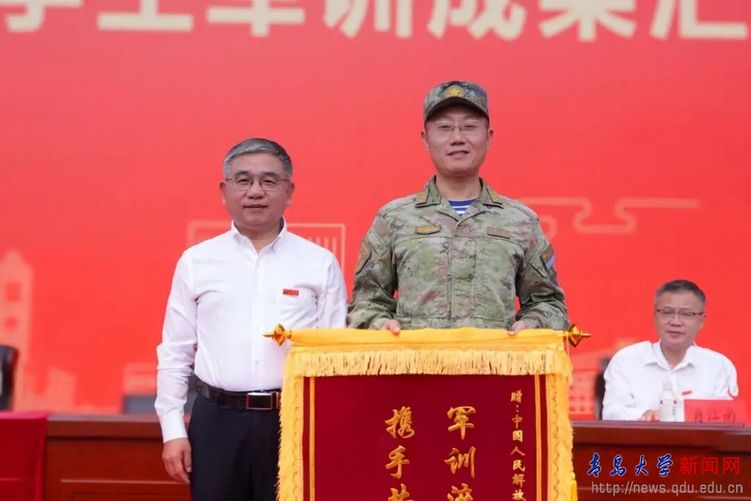 典礼中,校党委书记胡金焱向承训部队赠送锦旗和纪念品,对部队为学校军训工作提供的支持和教官们的辛苦付出表示感谢。