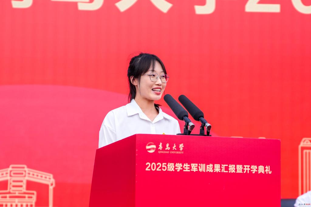 本科新生代表、青岛医学院邹佳成表达了对医学事业的热切期待与执着追求,表示要珍惜大学时光,向先辈学习,向师长看齐,不断追求卓越,将梦想刻写在奋斗的坐标上,练就强国本领,共同书写无愧于时代的青春华章。