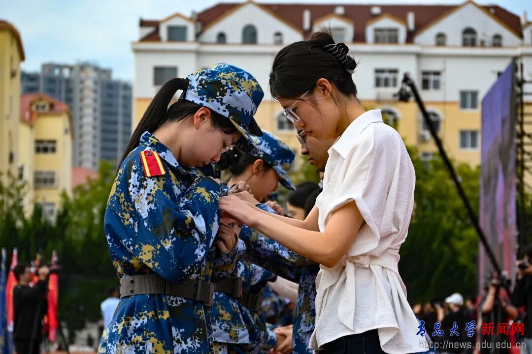 出院旗、戴校徽,胡金焱和教师代表为新生代表佩戴校徽,全体新生自行佩戴校徽。戴上校徽,“青大人”成为共同的名字。