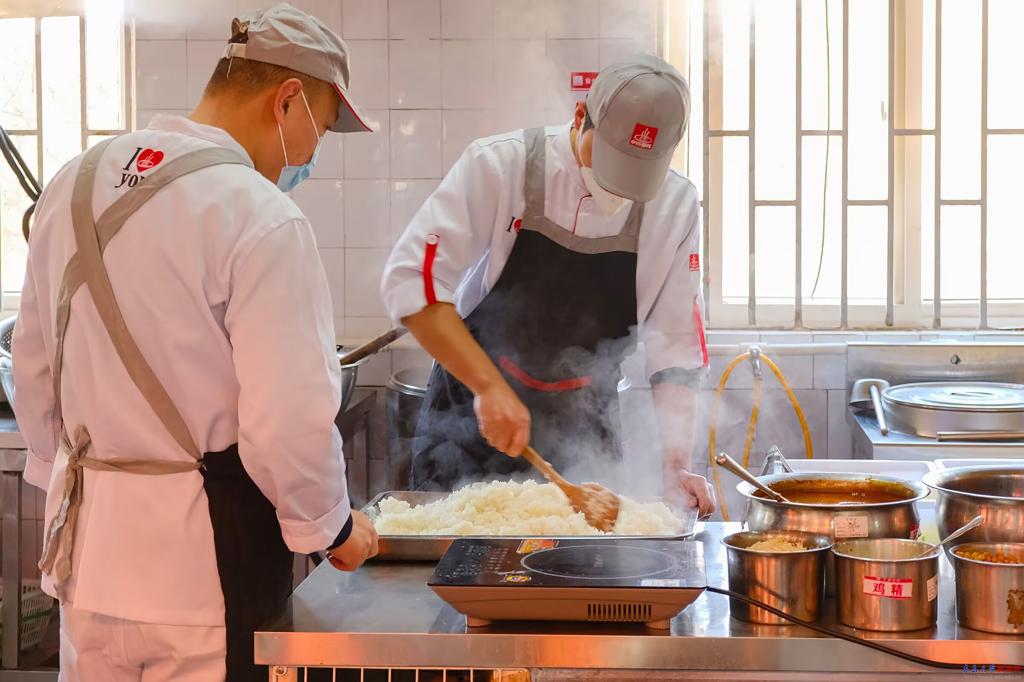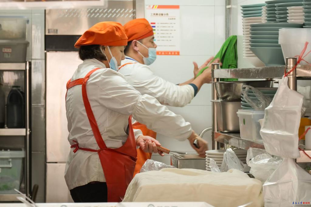 后勤管理处餐厅工作人员全力保障餐饮服务。后厨备餐有条不紊,餐台服务周到暖心,消杀工作绝不松懈,为留校师生筑牢节日饮食保障线。