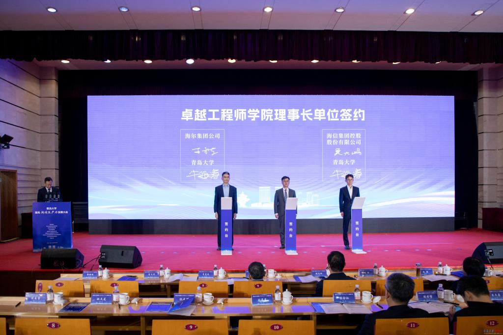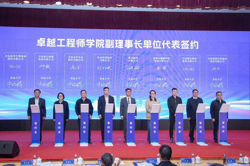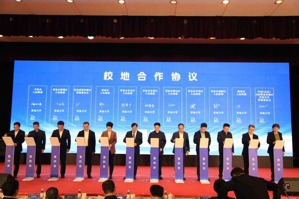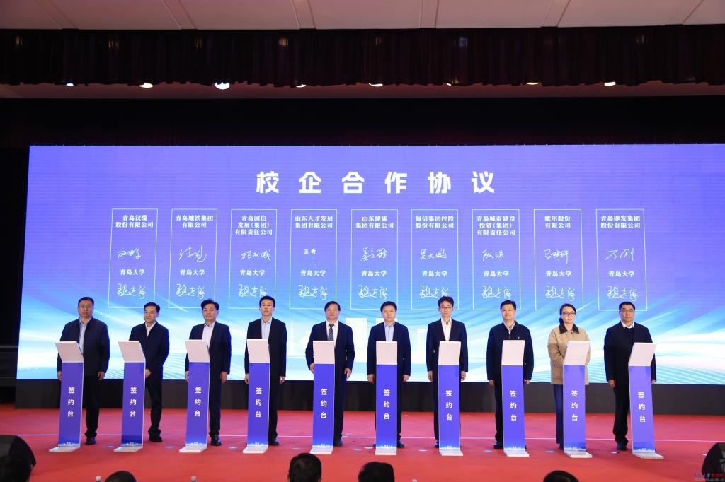 青岛大学与青岛市市南区人民政府、市北区人民政府、李沧区人民政府、崂山区人民政府、西海岸新区管理委员会、城阳区人民政府、即墨区人民政府、胶州市人民政府、平度市人民政府、莱西市人民政府以及中国(山东)自由贸易试验区青岛片区管理委员会等10个区市和自贸片区签订校地合作协议。与山东健康集团有限公司、山东人才发展集团有限公司、海信集团控股股份有限公司、青岛国信发展(集团)有限责任公司、青岛城市建设投资(集团)有限责任公司、青岛地铁集团有限公司、歌尔股份有限公司、青岛汉缆股份有限公司、青岛即发集团股份有限公司等9家企业签订校企合作协议。与海信集团控股股份有限公司、海尔集团公司签订卓越工程师学院理事长单位合作协议,与歌尔股份有限公司、鲁泰纺织股份有限公司、深圳市越疆科技股份有限公司、青岛冠中生态股份有限公司、青岛即发集团股份有限公司、青岛明月海藻集团有限公司、青软创新科技集团股份有限公司、青岛海华生物集团股份有限公司等8家代表企业签订卓越工程师学院副理事长单位合作协议。