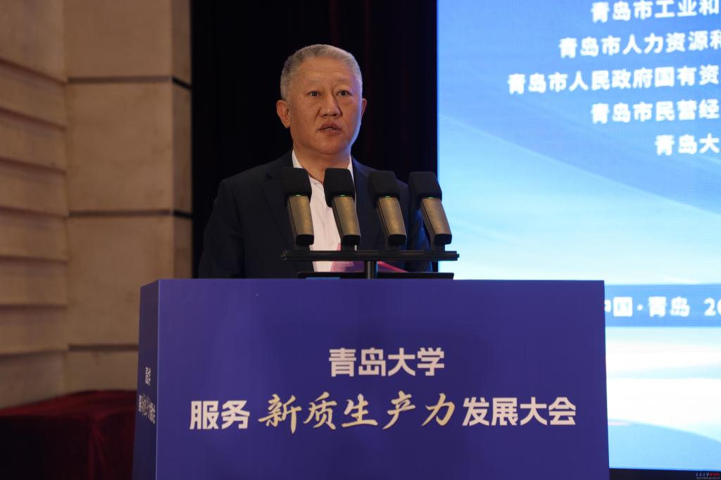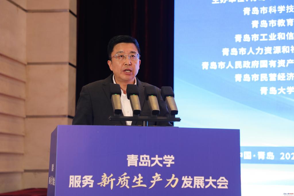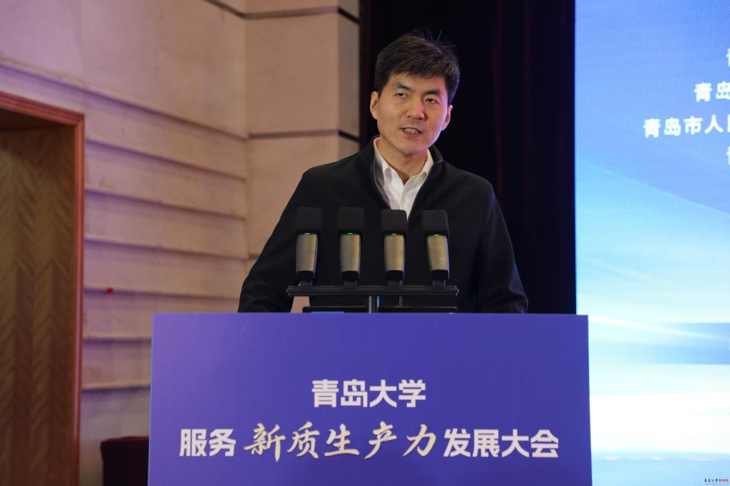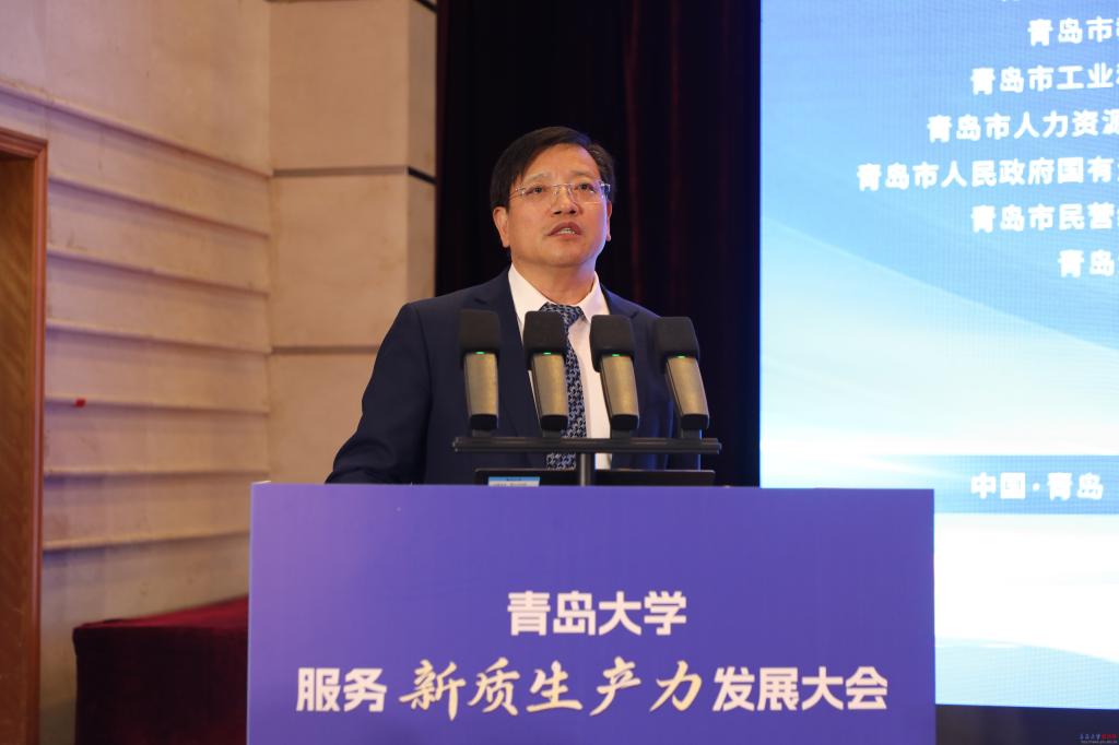 胡金焱在致辞中说,青岛大学以青岛城市命名,始终与青岛相伴而生、血脉相连,努力办好一所不负青岛人民深情厚爱、与青岛城市能级相匹配、以服务青岛发展为己任的大学。学校始终坚持“立足青岛、服务青岛、融入青岛,在服务山东全面求强中谋发展,在国家‘双一流’建设中求突破”的发展定位,陆续推出《青岛大学服务青岛新旧动能转换重大工程白皮书》《服务青岛行动计划》《服务山东新质生产力发展行动计划》《服务青岛“10+1”创新产业体系行动计划》。“十四五”以来,与20余个市、县(区)政府、120余家企业巩固或建立战略合作,签订科技服务协议2400余项。高校作为科技创新“策源地”、人才“聚集地”、成果转化“孵化地”,理应在发展新质生产力中展现更大作为。