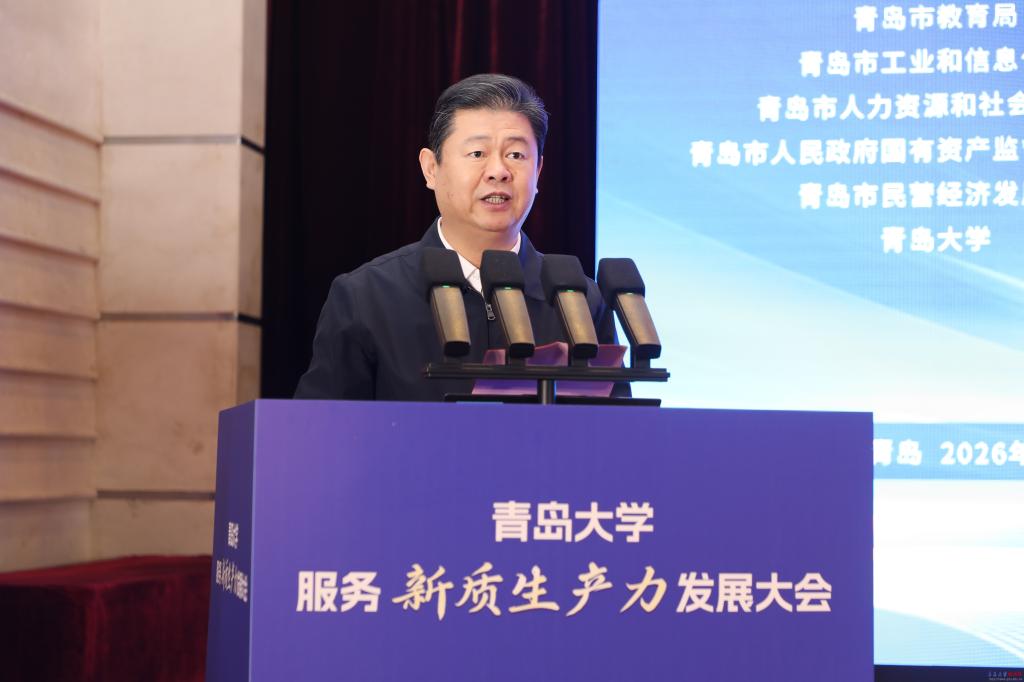 张志刚代表山东省教育厅,对大会的召开表示热烈祝贺。他表示,这次大会既是青岛深化校地协同、推动产教融合的务实之举,也是我省高校以科教融汇服务地方高质量发展、赋能新质生产力的生动实践。近年来,青岛市委、市政府高度重视、关心支持青岛大学建设发展,为学校提升办学能级、实现高质量发展厚植了坚实基础、营造了优良环境。青岛大学始终扎根青岛、面向山东,主动融入发展大局,为城市发展注入了强劲动能与发展活力。双方携手绘就了校地双向奔赴、共生共荣的美好图景。希望青岛大学以本次大会为契机,紧紧围绕教育强省建设目标任务,持续彰显办学特色、提升办学水平,切实扛牢服务青岛经济社会发展的“主力军”职责,奋力开创高水平大学建设的新局面。省教育厅将一如既往支持青岛大学的建设发展,支持驻青高校深度融入青岛、全面服务青岛,持续加大对人才培养、科技创新、校地协同的政策扶持与资源保障,为全省新质生产力发展提供坚实支撑。